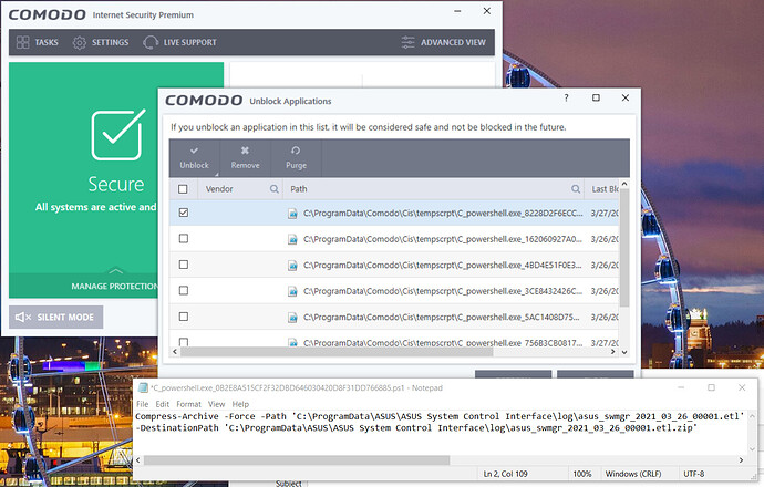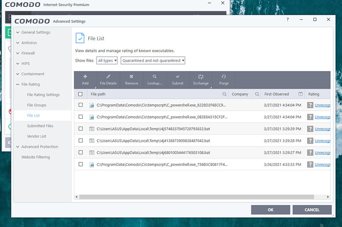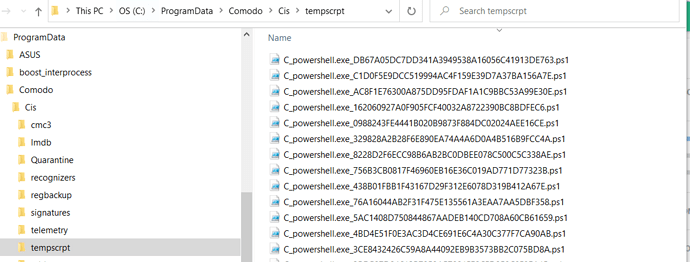 My ASUS laptop runs some sort of script on a regular basis. It is a powershell .ps1 or .bat file with a different file name each time. CIS is blocking each one and as each one is different I don’t know how to stop them being isolated. I assume that I can set up some sort of exception, but as a bit of a numptie I can’t work out how. Can anyone offer any suggestions?