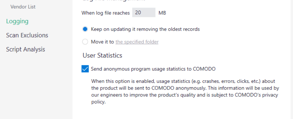 I believe itâs done automatically. You have the option on installation to send crash reports etc to Comodo as one of the installer options. You can see it in the Logging settings: