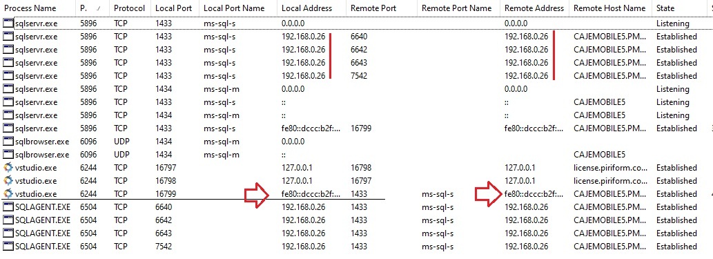 (2) I then start client software to connect to database server via TCP. I’m running a package named Valentina Studio 12. Software connects to server without any issue. Attached image is screenshot of NirSoft Currports showing open connection from client software to server (shown underlined). However, I am also able to test this using other tools (such as SQL Server Management Studio) with the same results.