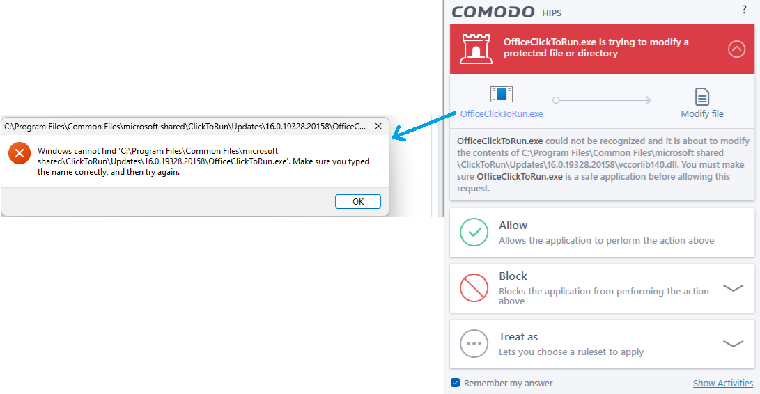Clicking on OfficeClickToRun.exe, in the HIPS pop-up alerts, opens another pop-up saying “Windows cannot find…” the file that HIPS blocked.