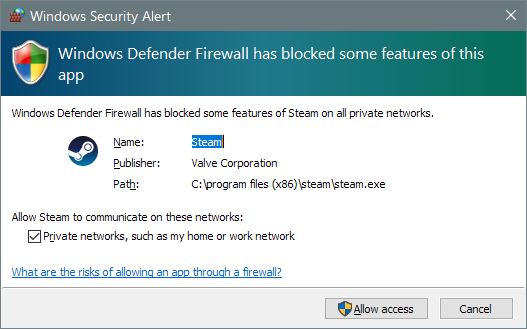5). Make sure the Allow box is checked for Private Networks for Steam