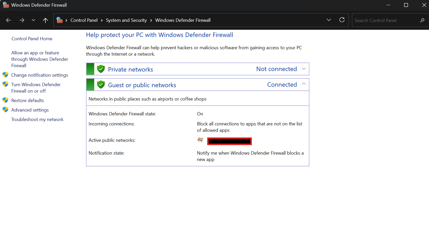 Can you share screenshot of Windows Security - Firewall & Network Protection - Public Network like the below. Also, using CFW’s Lycia Theme, can you send us a screenshot of the advanced view? Example of both below.