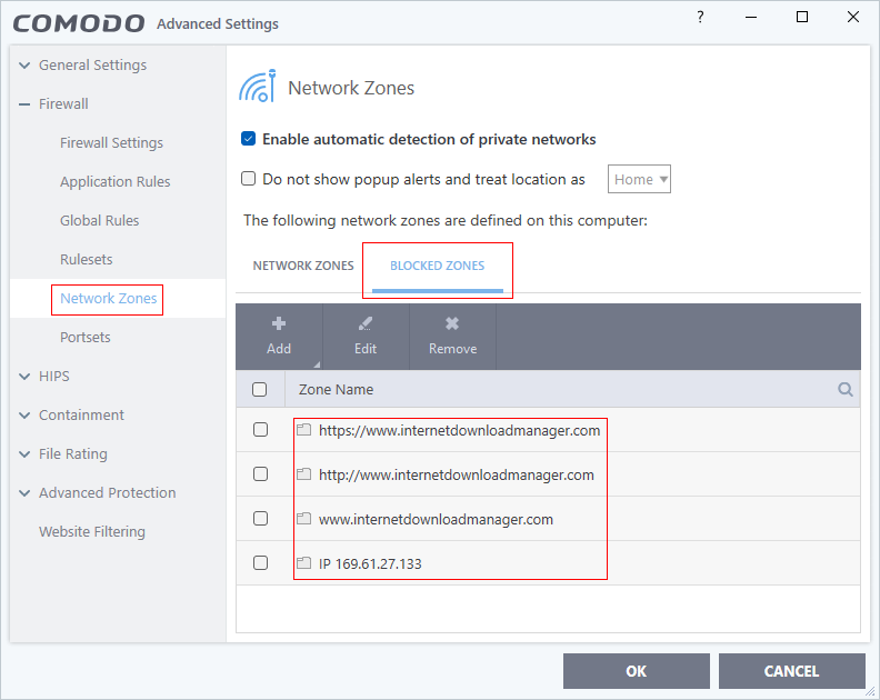 I’m recently coming from Windows 8.1 x64 running Comodo Firewall 8.4.0.5165 and this blocking feature via Network Zones was working as stated before. I was able to just simply add “www.internetdownloadmanager.com” w/ Host Name type and there would be a complete system wide block to that website, and almost instantly access was denied within a web browser as a test.